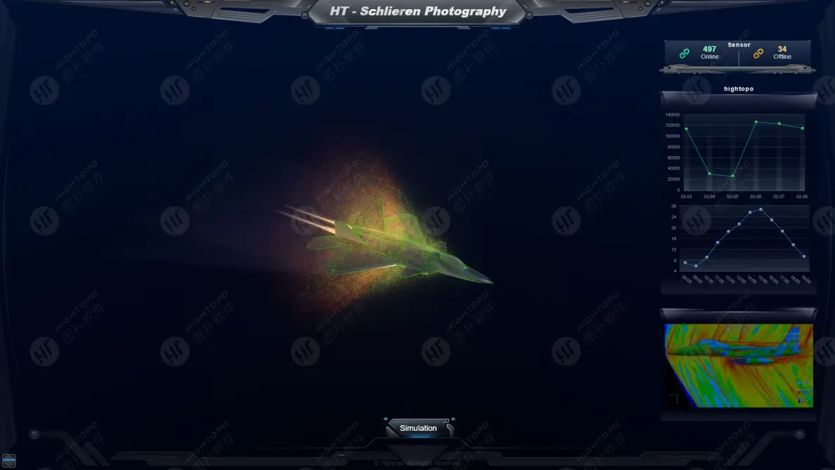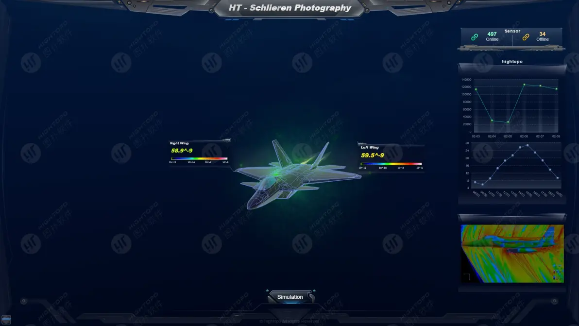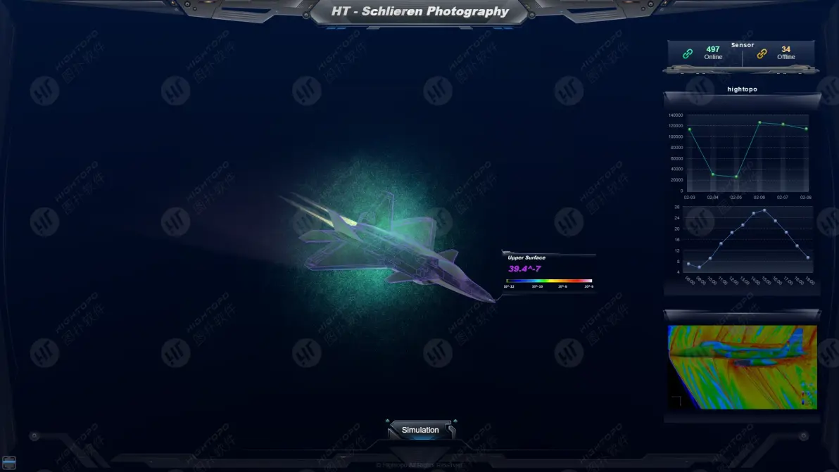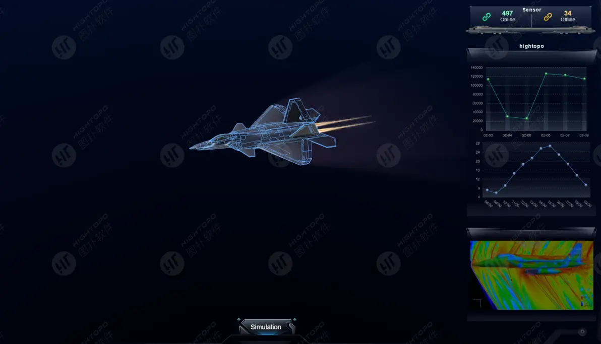 当模拟战斗机进行超音速巡航时,数字孪生模型通过图扑 HT 的可视化渲染,清晰呈现机翼表面的气流分布、温度场变化以及结构应力情况。工程师们无需再依赖传统的 “数据表格 + 想象” 模式,而是在直观的三维场景中,观察气流如何在机翼前缘分离、激波如何形成与传播,以及这些气动现象对战斗机隐身性能、飞行稳定性的影响。